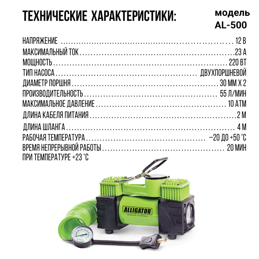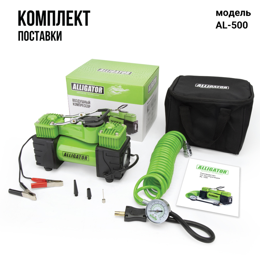 Самая мощная модель серии ALLIGATOR — двухпоршневой компрессор AL-500. Особенности модели: встроенный фонарь, защита от перегрева, шланг-удлинитель длиной 4 м. Два поршня распределяют нагрузку и тем самым снижают износ электродвигателя. Корпус модели сделан из высококачественного металла. Питание компрессора осуществляется от аккумулятора автомобиля, к которому он подключается через зажимы АКБ.