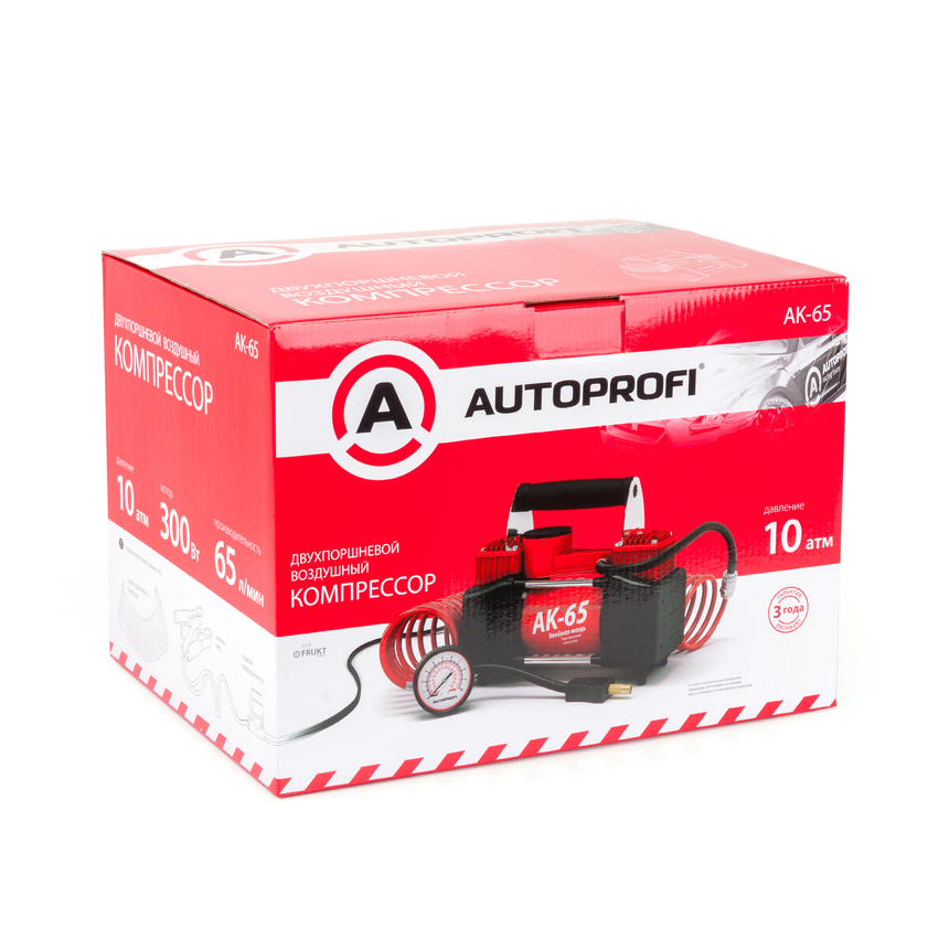 Компрессор воздушный AUTOPROFI, 65 л./мин., 12V/30A, 300W, 10 Атм., двухпоршневой, шланг 8 м., питание от АКБ, набор из 4-х переходников для надувн. изделий, сумка