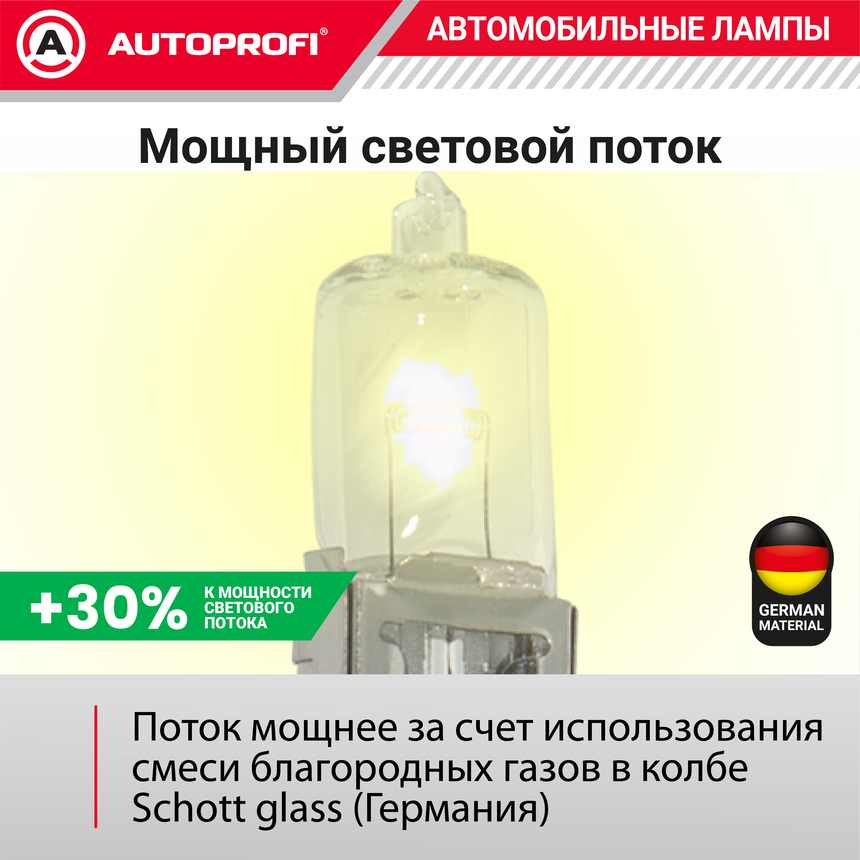 Компания AUTOPROFI выводит на рынок лампы с мощностью соответствующей требованиям автопроизводителей, при этом, модели серии LONG LIFE (+30%) дают более мощный световой поток только за счет использования смеси благородных газов в колбе и правильно подобранной толщины спирали накала. Кварцевое стекло ламп AUTOPROFI защищает автомобильную фару изнутри от ультрафиолетового излучения. ЭТО ЗНАЧИТЕЛЬНО ПРОДЛЕВАЕТ РЕСУРС дорогостоящих фар современного автомобиля. Фары дольше сохраняют прозрачность, тем самым, делая езду в тёмное время суток – безопасной.