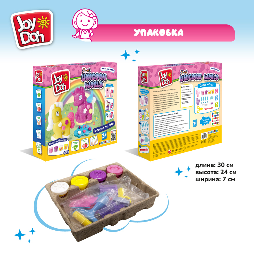 Масса для лепки Joy Doh, набор UNICORN WORLD - МИР ЕДИНОРОГОВ, 3D формы, украшения, 21 аксессуар, 4 баночки с тестом  с блестками, (4 х 50 грамм)