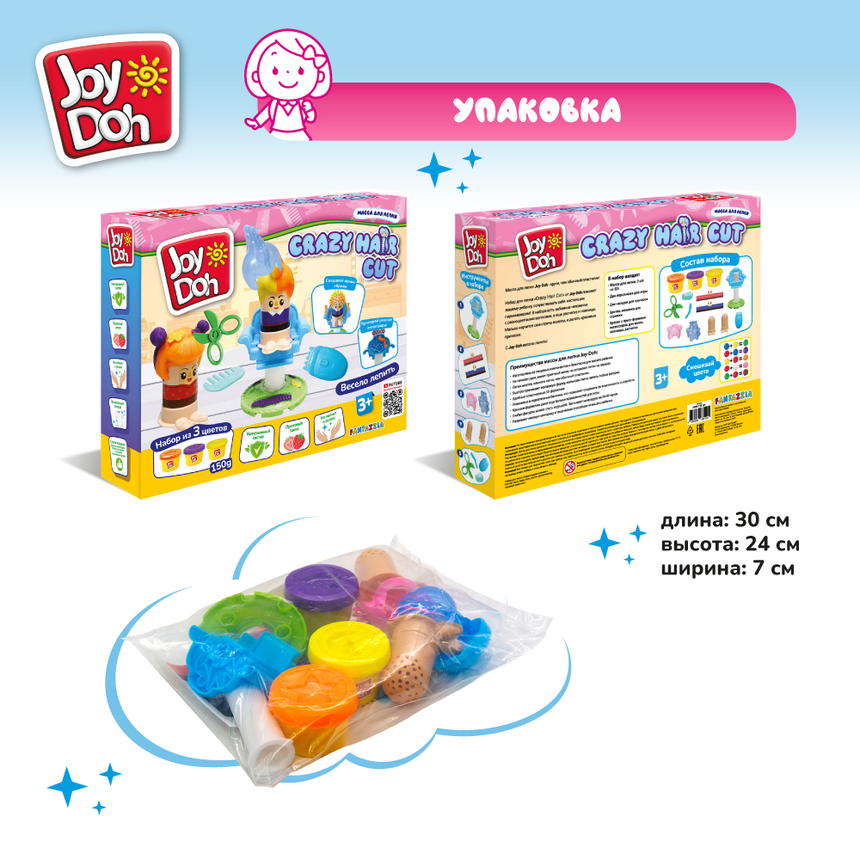 Масса для лепки Joy Doh, набор CRAZY HAIR CUT - СУМАСШЕДШАЯ СТРИЖКА, сменные насадки, 9 аксессуаров,  3 баночки с тестом,  (3 х 50г.)