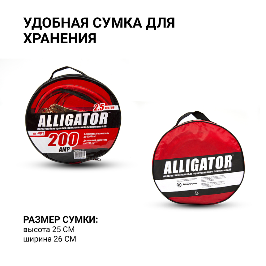 Провода прикуривания Аллигатор, 100% CCA, морозостойкие, 200 А, длина 2,5 м., брезент. сумка