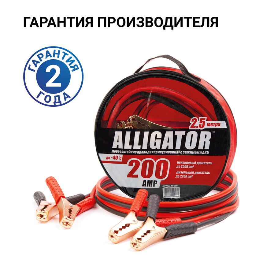 Надёжный и практичный аксессуар – комплект проводов «прикуривания» BC-200 из классической серии «Alligator». Провода обладают длиной 2,5 метра и пропускают ток силой до 200 ампер. Это позволяет использовать их для запуска автомобилей, оснащённых бензиновыми двигателями объёмом до 1,6 литра.