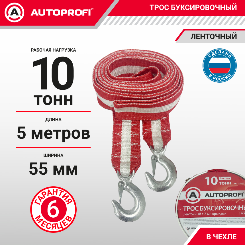 Трос буксировочный ленточный "AUTOPROFI" 10 т, 5 м, 2 крюка, сумка TRL-100/1
